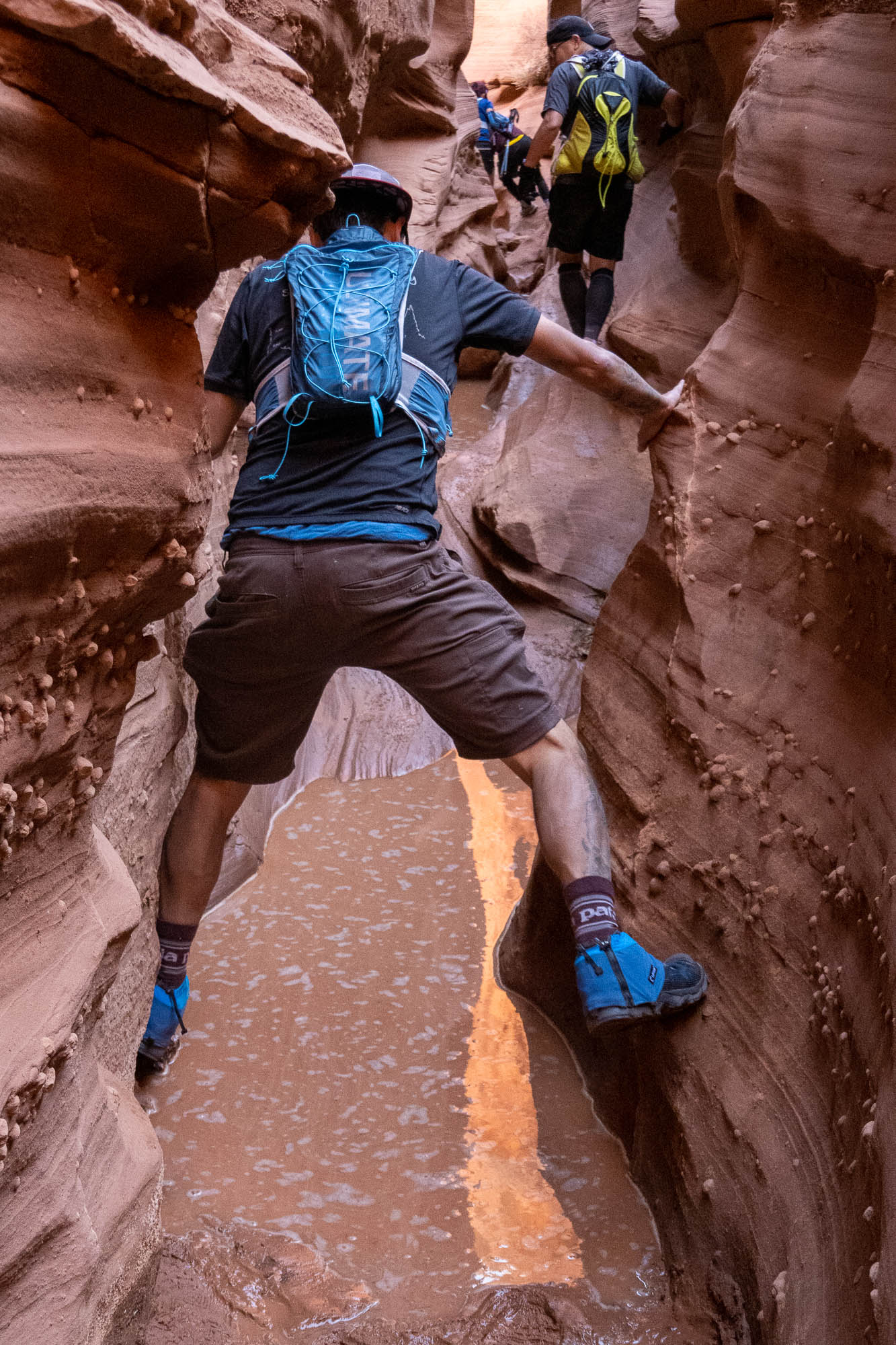 After crossing the road and a stop at the Water Holes aid station, it was time to scramble down into Water Holes Canyon! This was a fun little scramble down to an incredible slot canyon, and the running goes back to walking.