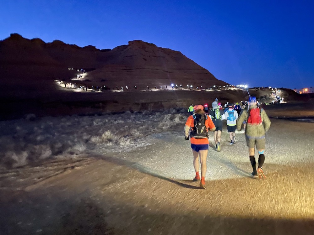 Eventually the canyon started to widen, and before we knew it we were back to exposed trail in the sun. The shade was welcome while it was there! And then it's back to the Horseshoe Bend aid station, where my drop bag was. We spent longer here this time around, taking full advantage of the message gun and all of the food options. I opted not to take my layers back, but I did grab my flashlight. I never ended up wearing any extra layers in the morning, so I figured I wouldn't need them at night either when it wouldn't be as cold.